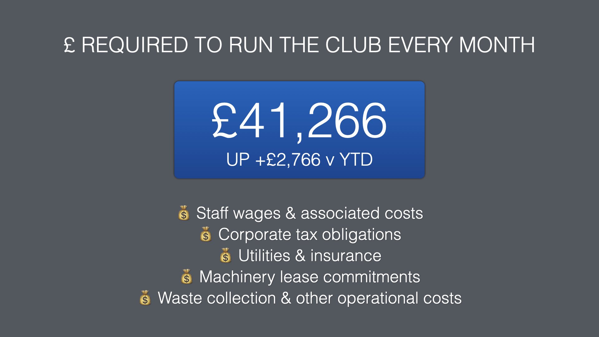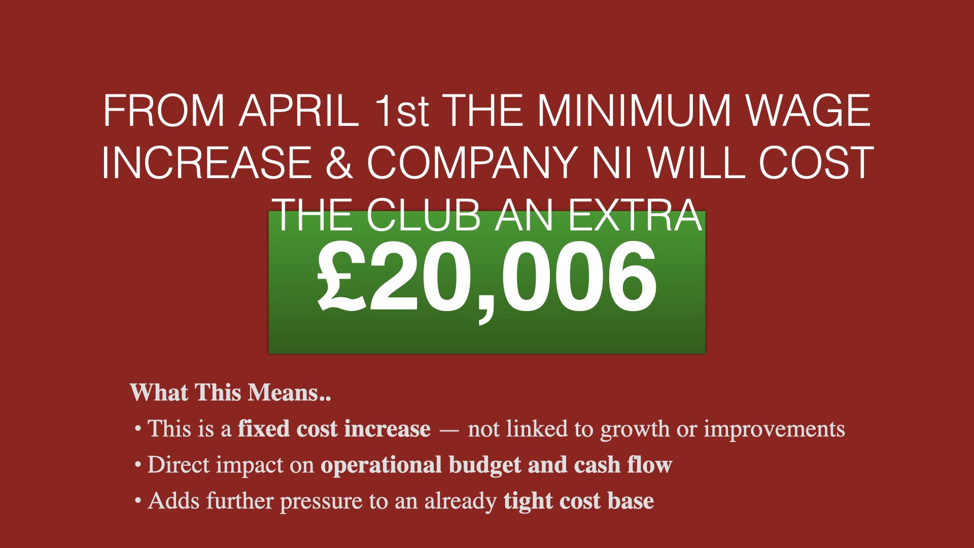 With recent government changes to the minimum wage and with National Insurance contributions, this will cost the club an extra £20,006.