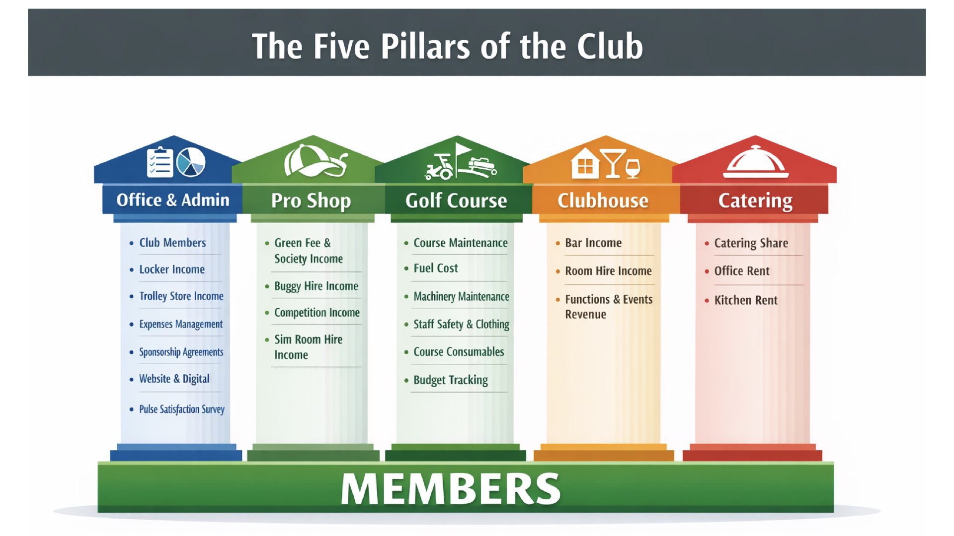 This model is built around the Five Pillars of the Club, with Members as the foundation.